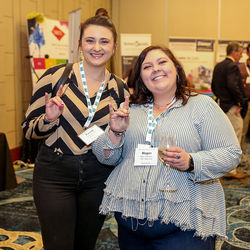 ![]() Cassie Gallavotti (L) of Belk and Megan Davidson of SDL Atlas flash the N.C. State Wolfpack sign during a reception. | ![]() (L-R) Kelly Mallory, Caitlin Wilson and Doug Bynum of natific AG at their tabletop exhibition. | ![]() Robina Hogan of Hogan Consulting LLC and Constantine Ghionas of Omega Chemicals at her tabletop. |